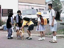 近所のやさしいお兄さんお姉さんに連れてもらい登校します。7時30分に出発します。 いつもぎりぎりに行くので待っていてもらいます。学校までは20分かかります。 ランドセルがとても重いです。